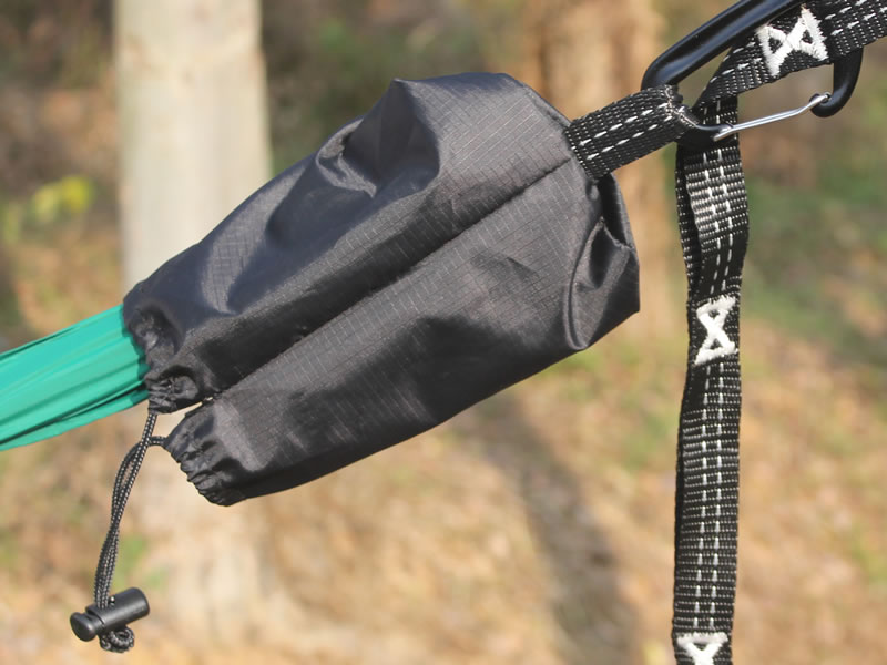 - Function: Once your hammock is deployed, re-attach the sack to the ridgeline by threading the shock cord around the ridgeline and securing it with a cord lock (for the bottom), and clip the top loops to the ridgeline. The open sack now hangs as a ready-to-use catch-all bag.