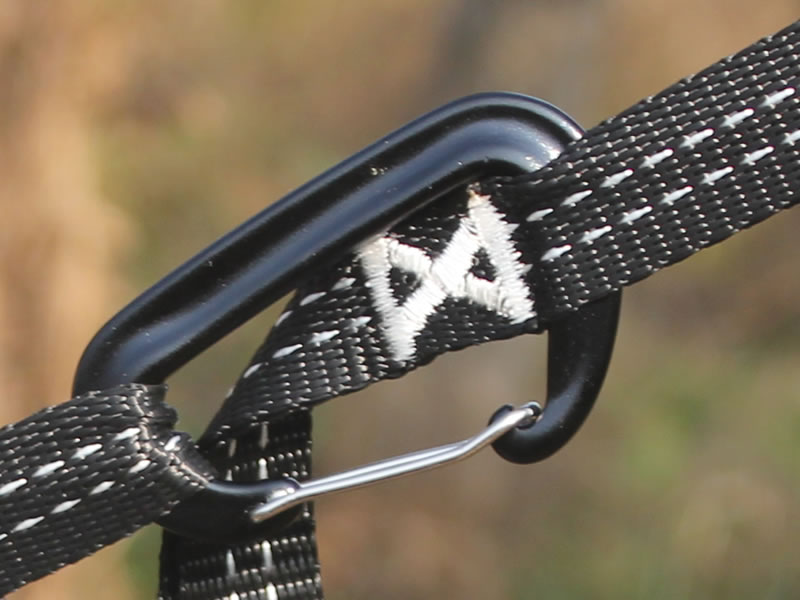 The carabiner connects the strap to the hammock—it does not replace the strap or go directly around the tree.