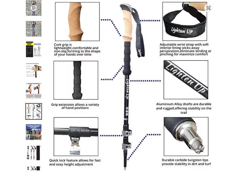 - Comfortable Grips and StrapsYou’ll be holding these for miles, with and without a pack.Grips: Cork is ideal as it molds to your hand and wicks moisture. Foam (EVA) is soft and sweat-absorbent. Both are excellent choices.Straps: Padded, adjustable straps are crucial. They allow you to transfer weight off your hands, which is especially important under a heavy pack.