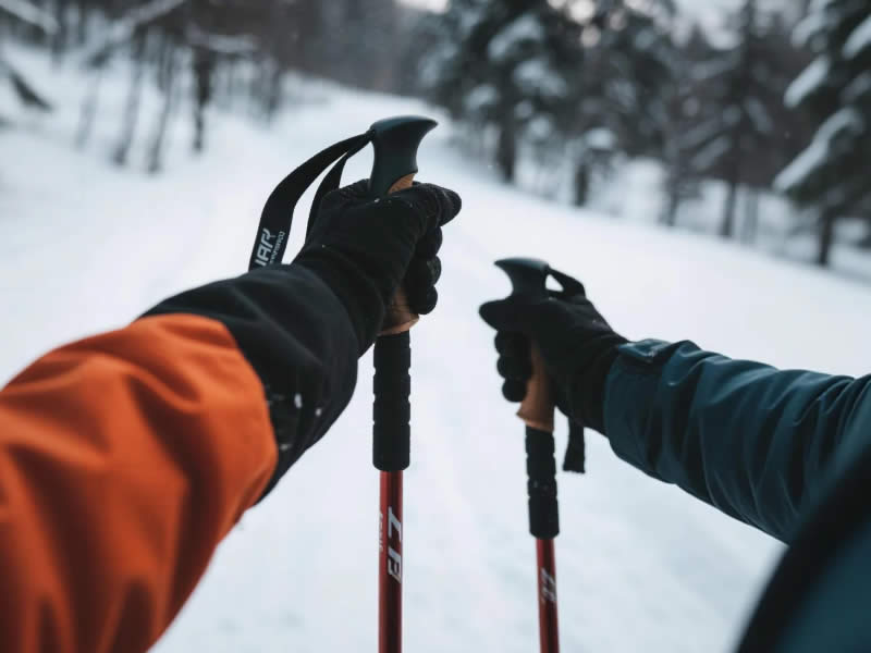 Rubber grips become cold, stiff, and slippery in freezing temperatures. EVA foam stays warmer to the touch and provides good insulation. Cork is also acceptable but can feel cold initially. Many winter poles feature an extended foam grip – this lets you choke down without exposing your fingers to the cold shaft.
