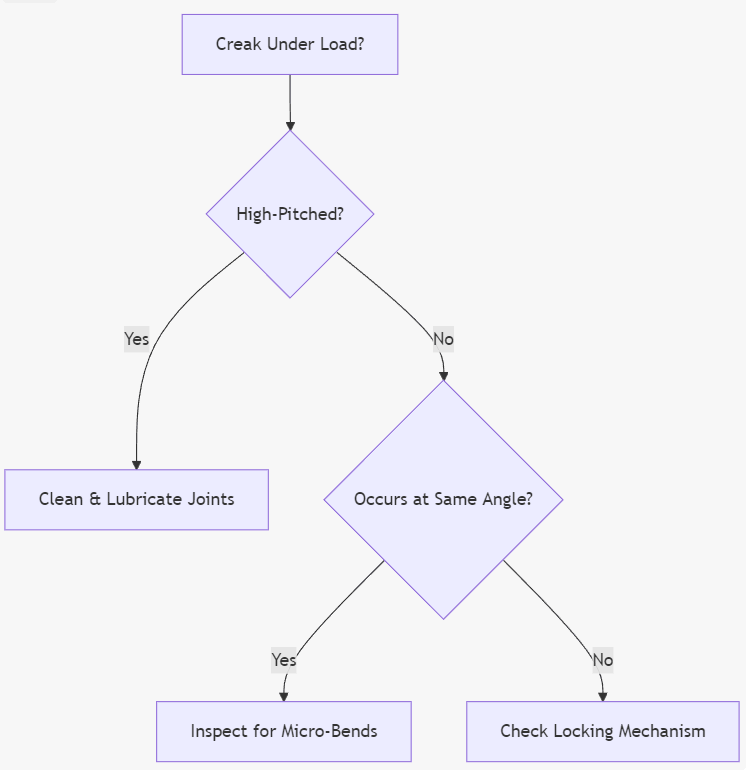 - Tribological CreakingCause: Metal-on-metal friction at joints/locksSound: High-pitched "chirping" or rapid "ticking"Triggers: Grit intrusion, dried lubricant, oxidized surfaces