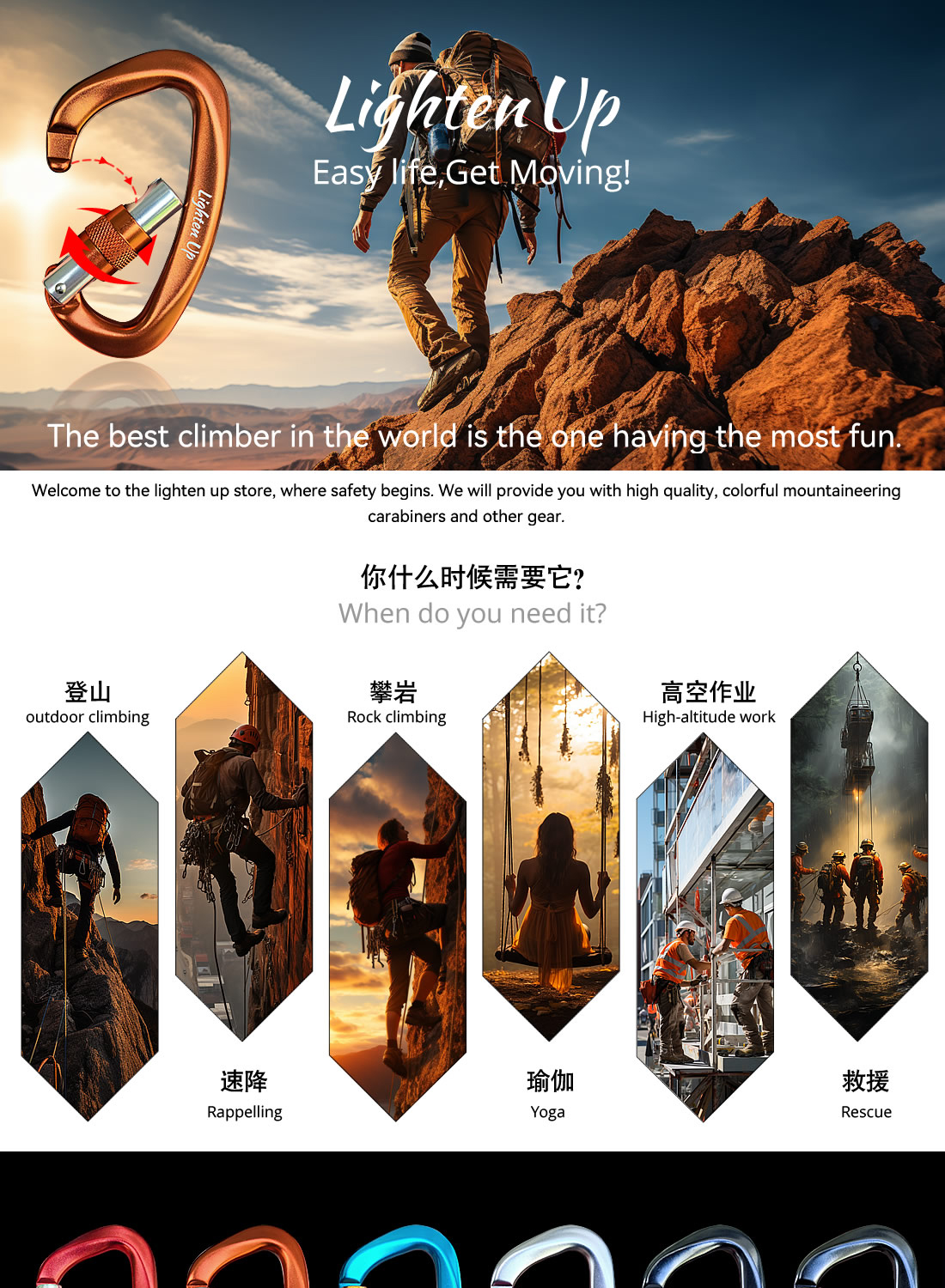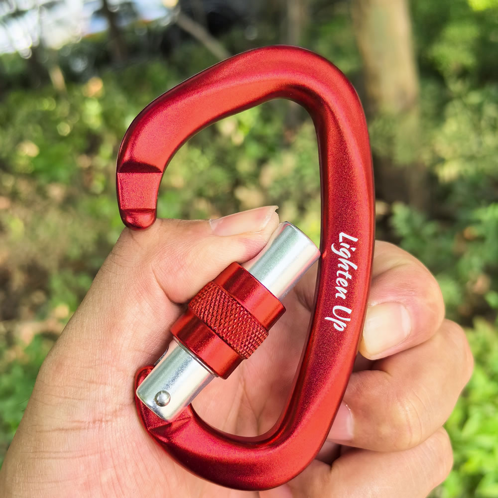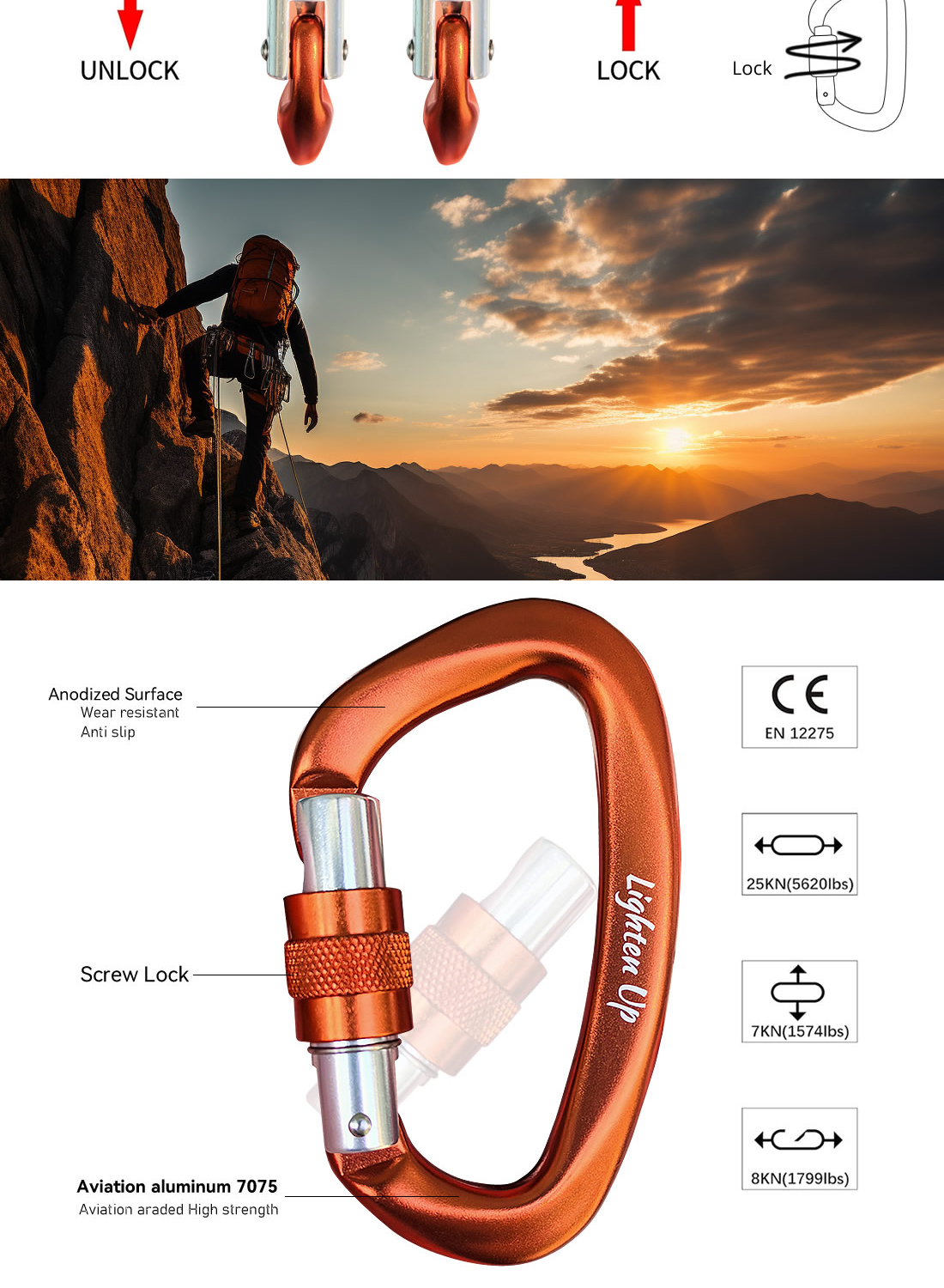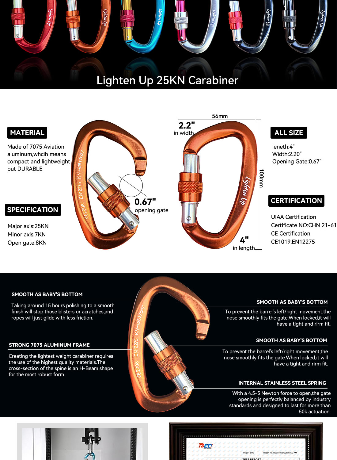 LIGHTEN UP 25kN climbing carabiners are crafted from high-strength 7075 aviation aluminum alloy, weighing only 0.06g (0.13lbs) each and measuring 105.8cm (3.93*2.28inch), offering a perfect balance of durability and portability. The D-shaped design ensures optimal balance and connectivity, while the auto-locking mechanism guarantees safety during use. CE certified and accompanied by test reports, these carabiners meet international safety standards. Available in multiple colors, they cater to diverse style preferences. Whether for rock climbing, camping, or backpacking trips, these carabiners are your reliable companion for outdoor adventures.