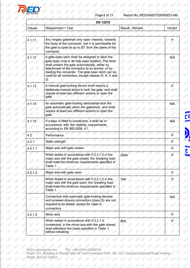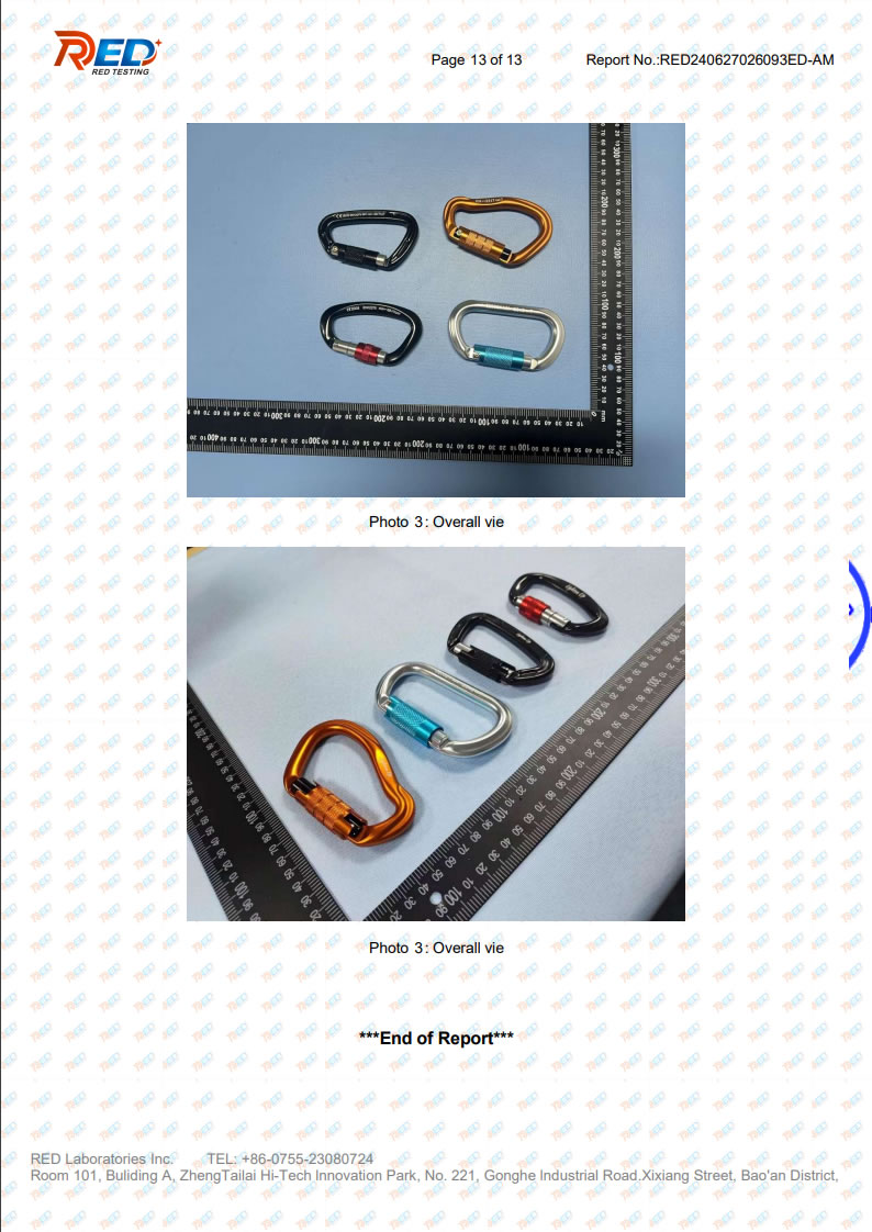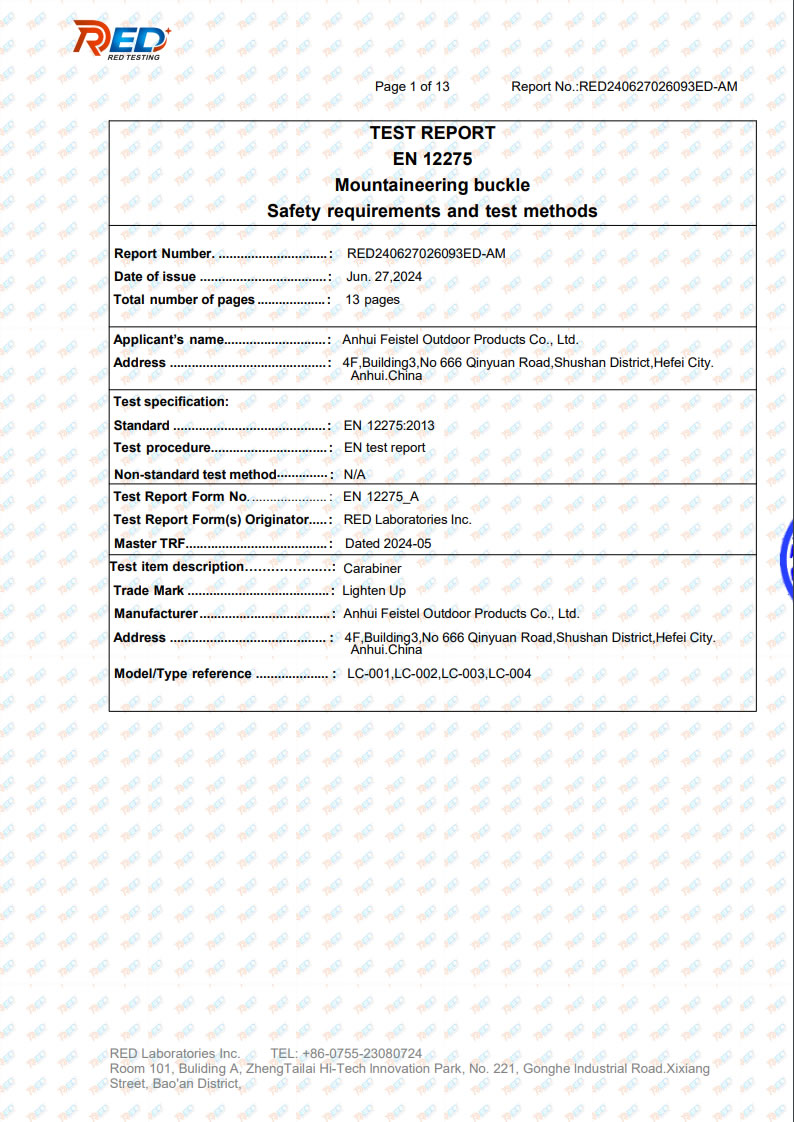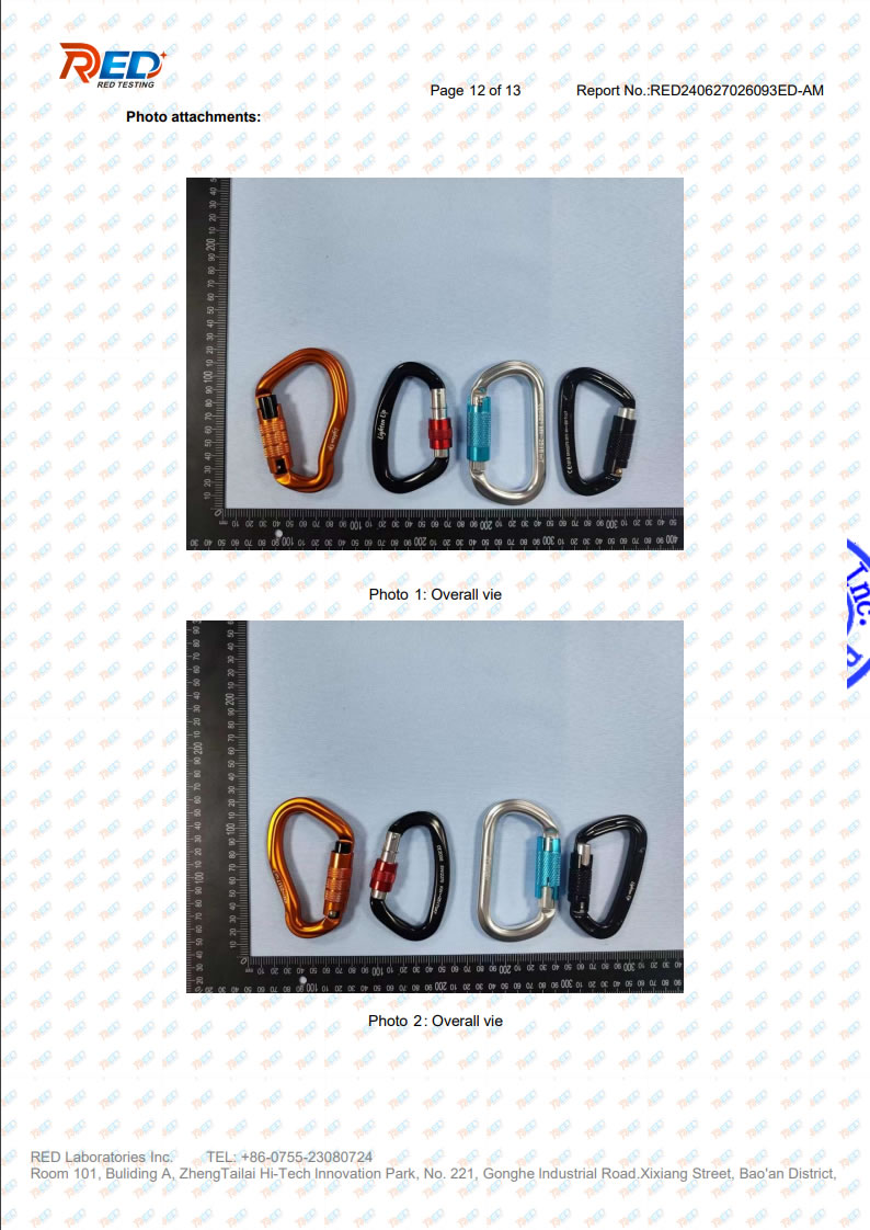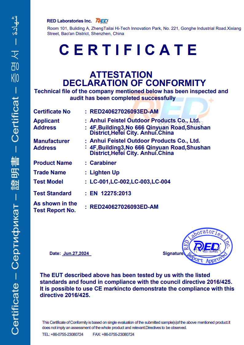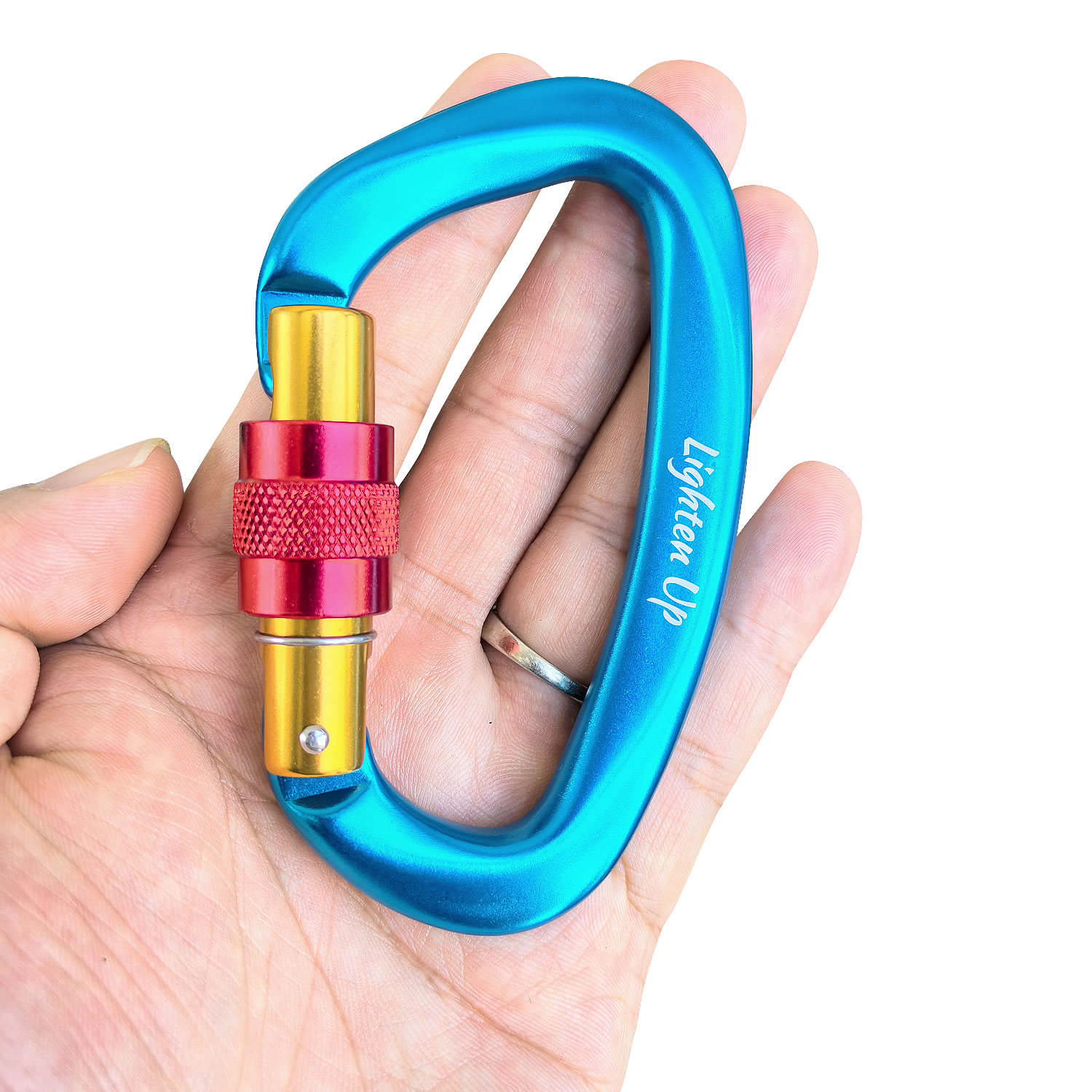 LIGHTEN UP 25kN climbing carabiners are crafted from high-strength 7075 aviation aluminum alloy, weighing only 0.06g (0.13lbs) each and measuring 105.8cm (3.93*2.28inch), offering a perfect balance of durability and portability. The D-shaped design ensures optimal balance and connectivity, while the auto-locking mechanism guarantees safety during use. CE certified and accompanied by test reports, these carabiners meet international safety standards. Available in multiple colors, they cater to diverse style preferences. Whether for rock climbing, camping, or backpacking trips, these carabiners are your reliable companion for outdoor adventures.