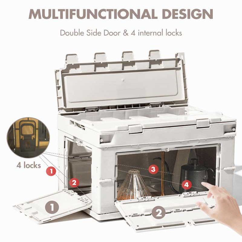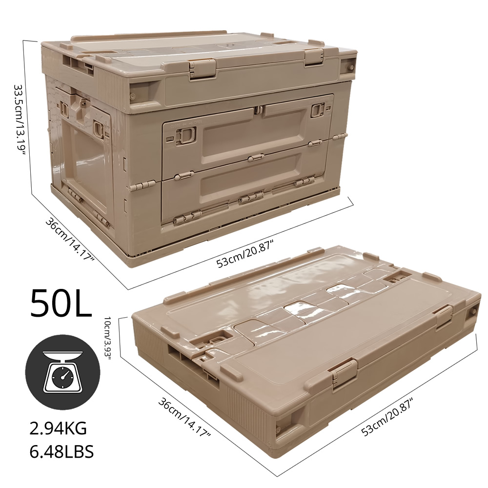The box includes a non-slip grid base for stability on uneven surfaces, making it ideal for outdoor adventures. Two lockable side panels allow easy access to items from the sides, while the top lid with a secure lock mechanism ensures quick and convenient access during preparation. With a load capacity of over 35kg when expanded and up to 100kg when folded, this Multifunctional Foldable Bag is built to handle heavy-duty use. Whether you’re camping, picnicking, or organizing your car trunk, this 50L Storage Box is a reliable and practical solution for all your storage needs.