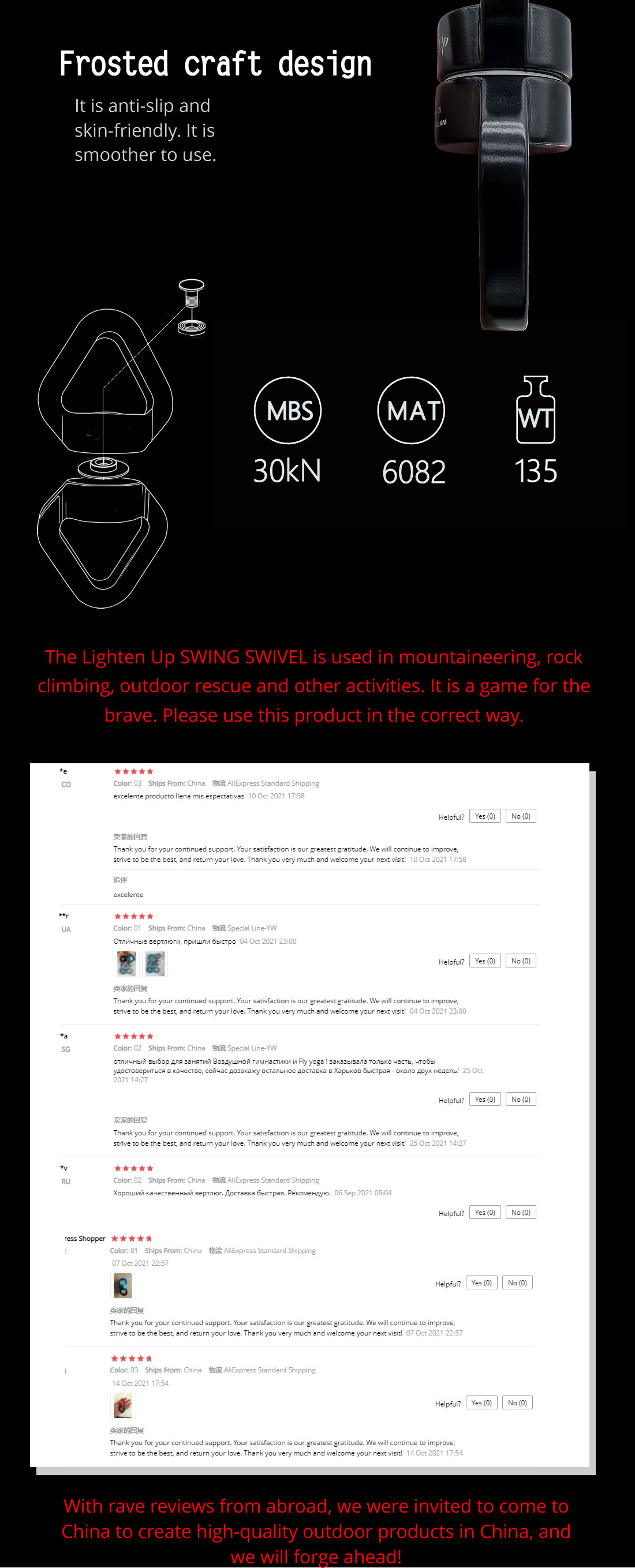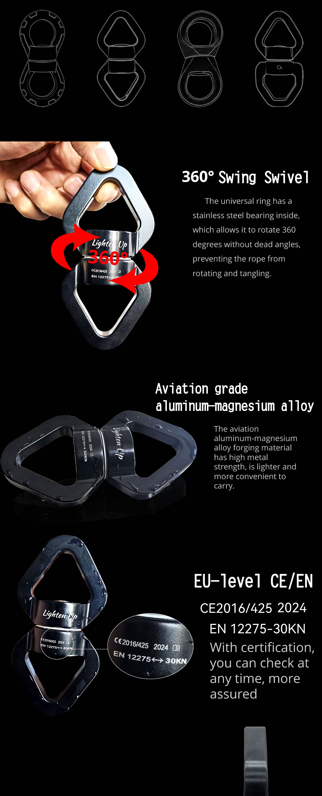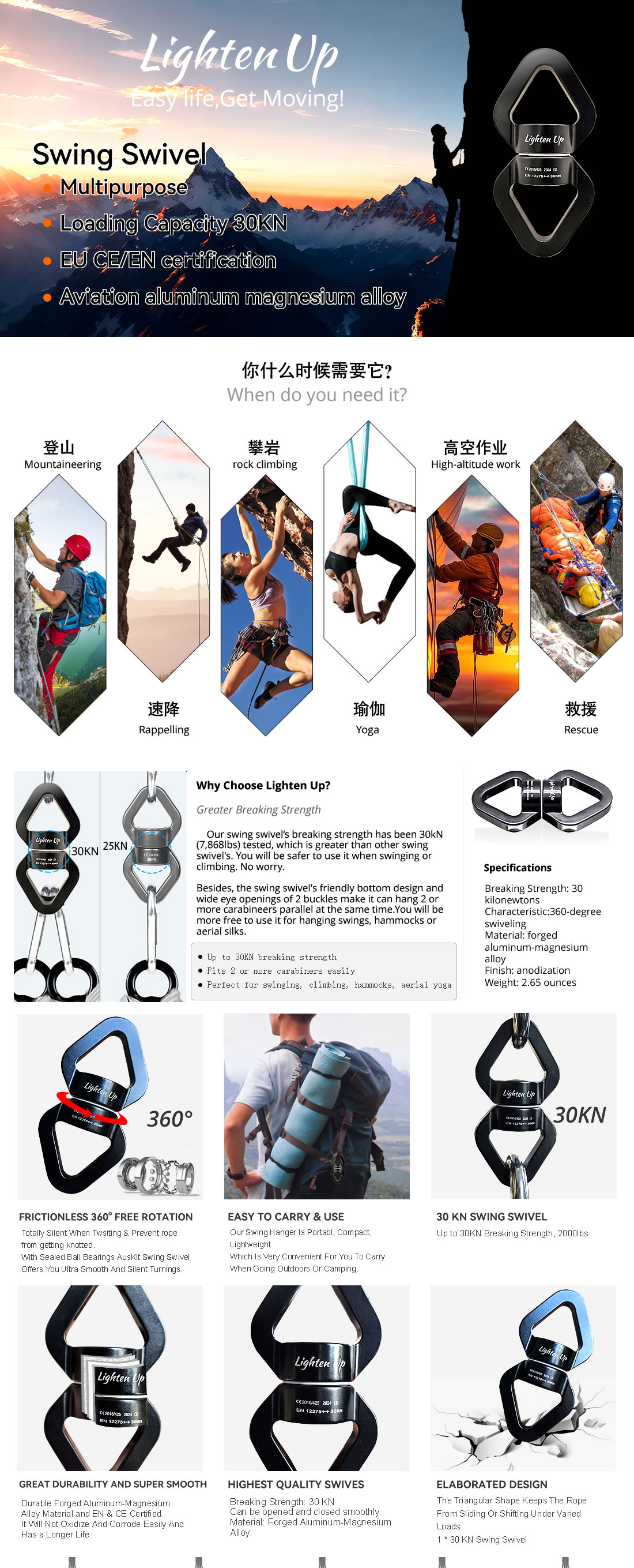 - Smooth 360° Rotation: The universal rotating connector reduces rope twist, providing seamless movement for climbing, yoga, and hammock applications.